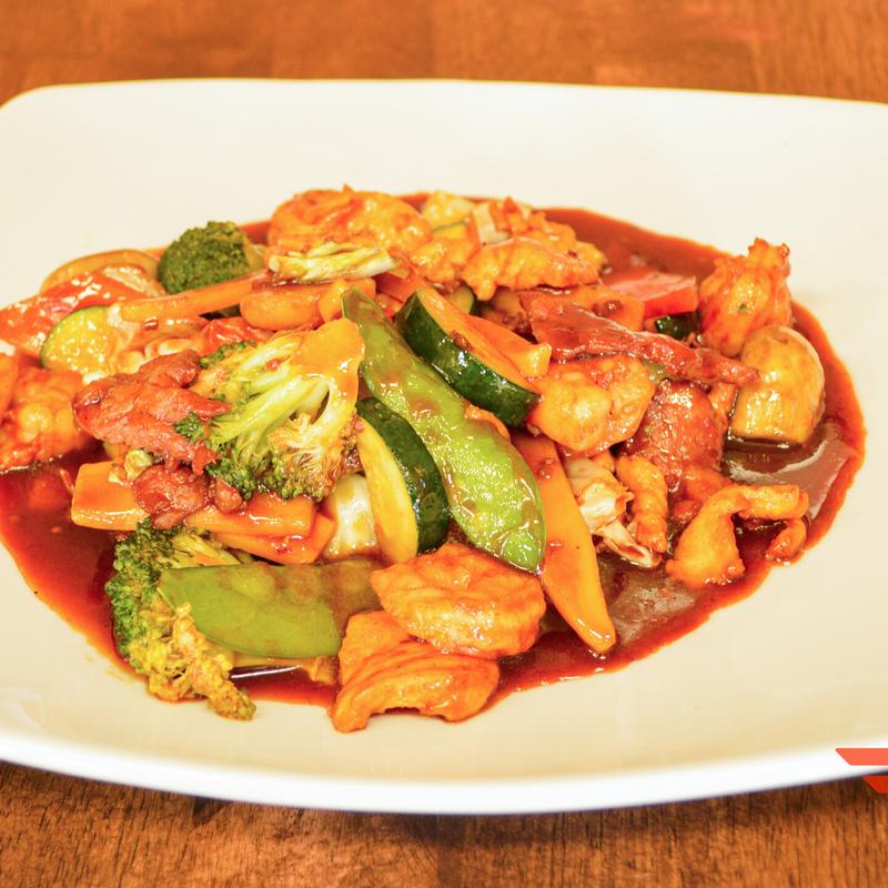 Beef, chicken, and shrimp sautéed with bamboo shoots, broccoli, cabbage, carrots, mushrooms, snow peas, water chestnuts, zucchini in a brown sauce