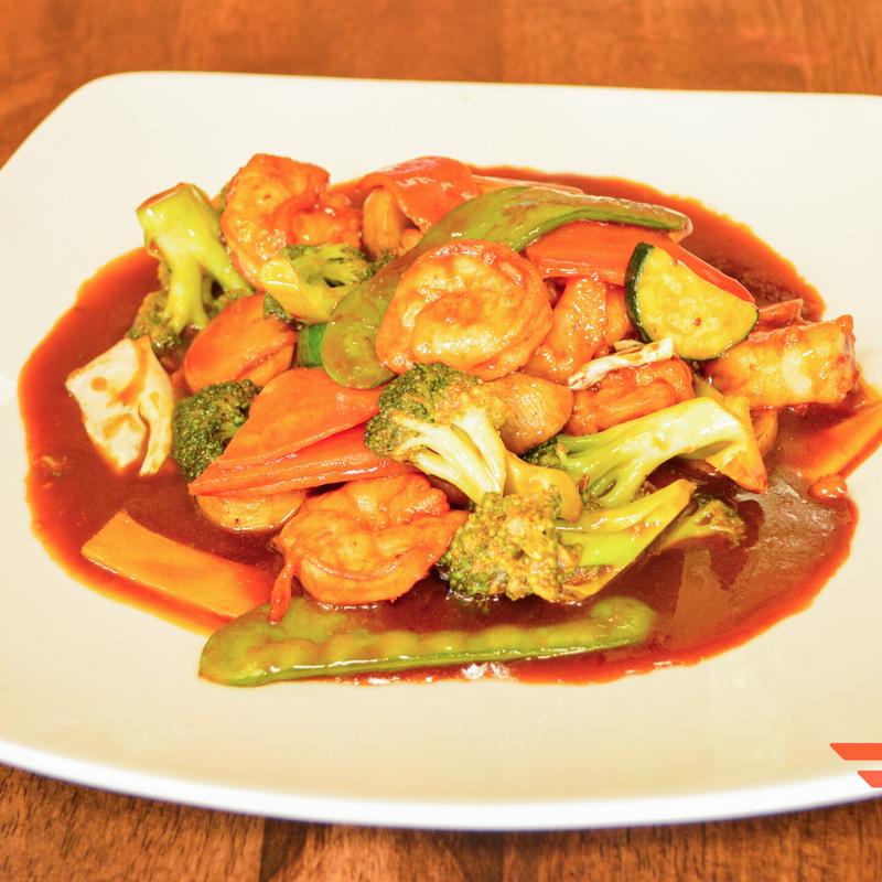 Shrimp sautéed with bamboo shoots, broccoli, cabbage, carrots, mushrooms, snow peas, water chestnuts, zucchini in a brown sauce