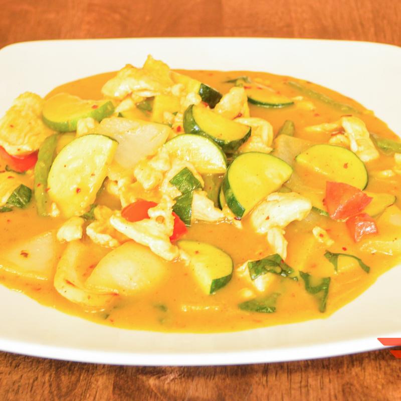 Chicken sautéed with basil, bell peppers, green beans, zucchini, onions in a yellow curry sauce