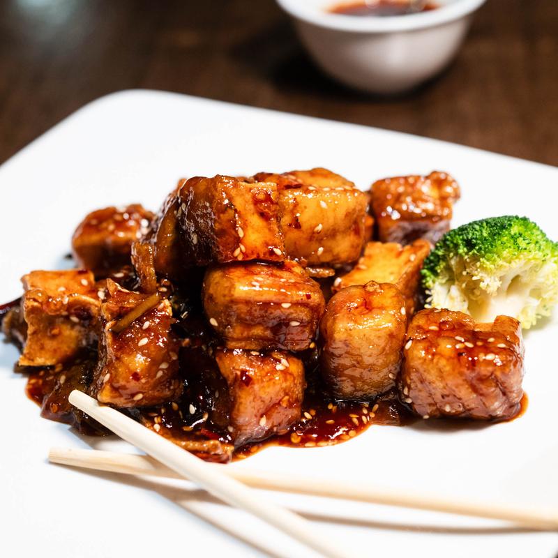 Fried tofu sautéed in a sweet, spicy sesame sauce with sesame seeds
