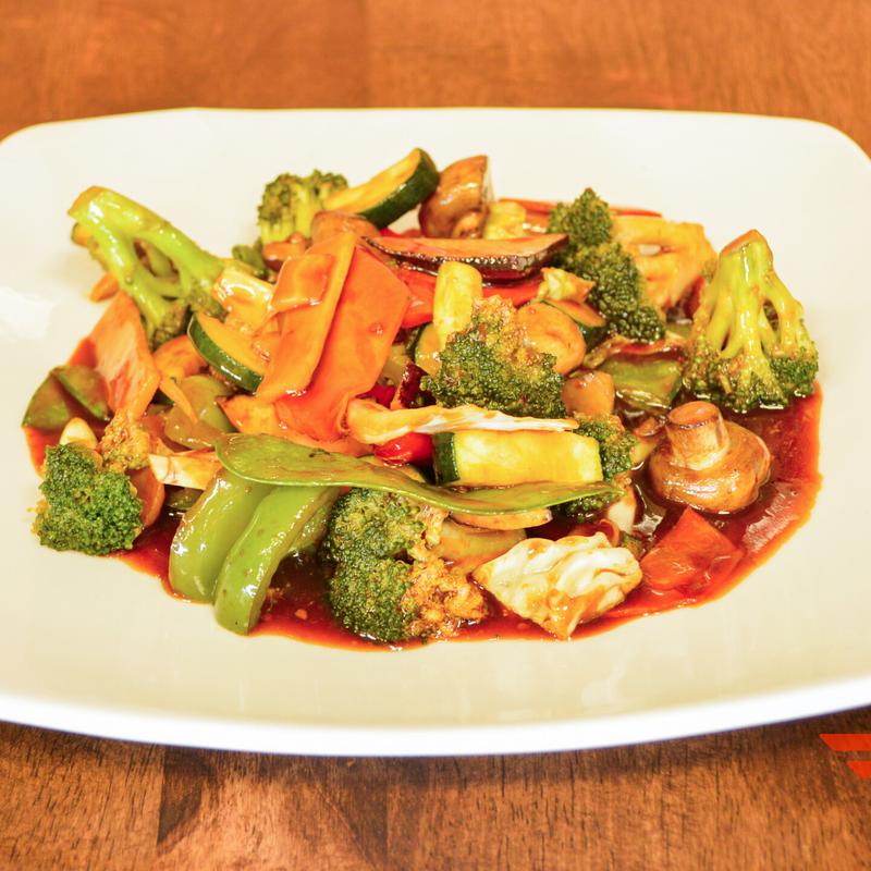Fried tofu sautéed with bamboo shoots, broccoli, cabbage, carrots, mushrooms, scallions, snow peas, water chestnuts, zucchini in a brown sauce
