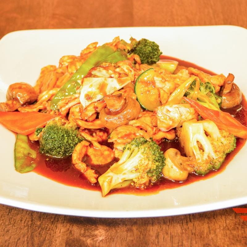Chicken sautéed with bamboo shoots, broccoli, cabbage, carrots, mushrooms, snow peas, water chestnuts, zucchini in a brown sauce