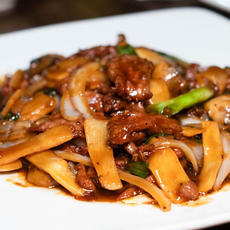 Beef sautéed with bamboo shoots, green and white onions, mushrooms in a brown sauce