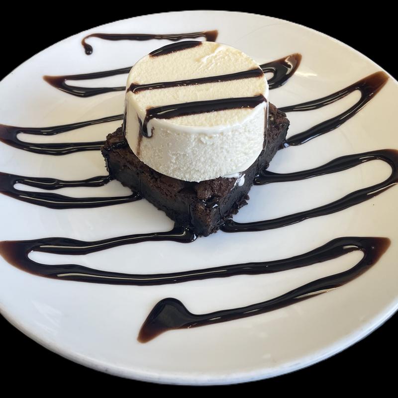 Warm chocolate brownie drizzled with chocolate syrup and served with vanilla ice cream