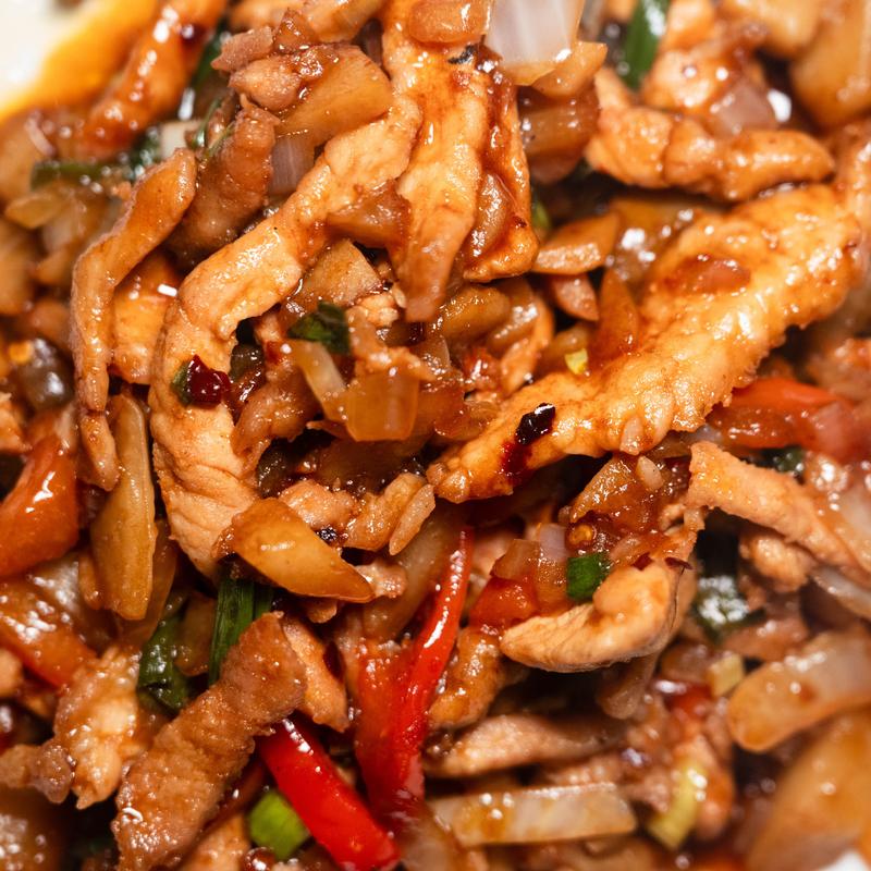 Pork sautéed with bell peppers, chili peppers, green and white onions, water chestnut in spicy garlic sauce