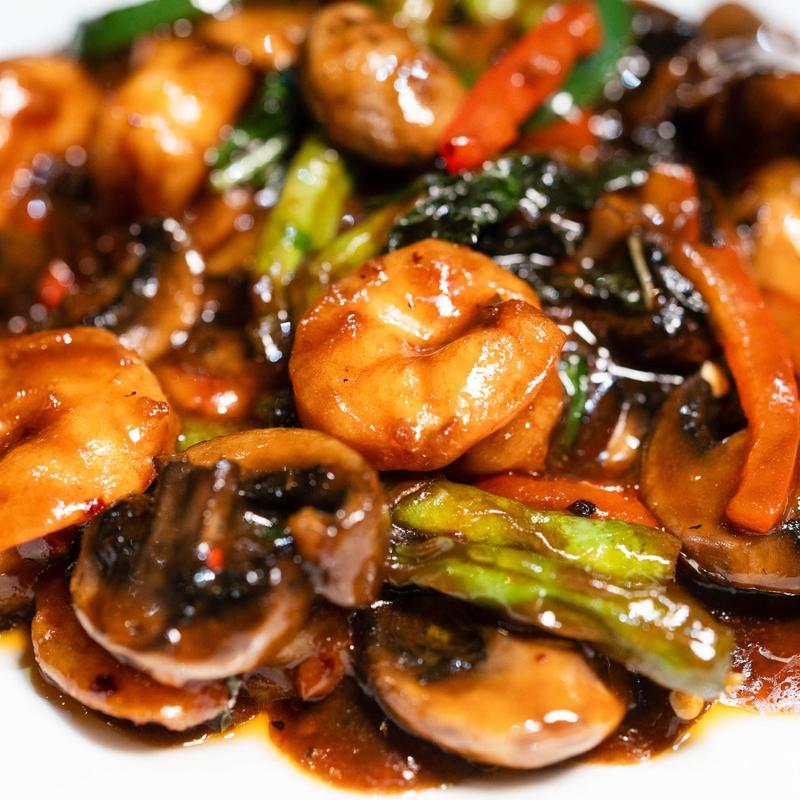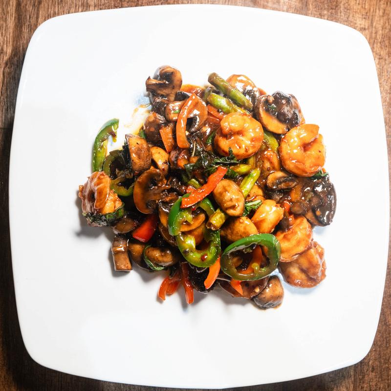 Shrimp sautéed with basil, bell peppers, green beans, jalapeños, mushrooms in a brown sauce