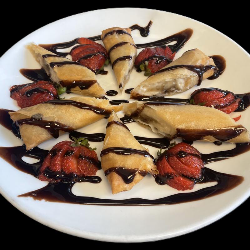 Banana wrapped in a wonton wrapper and fried. Drizzled with chocolate syrup and served with fresh strawberries