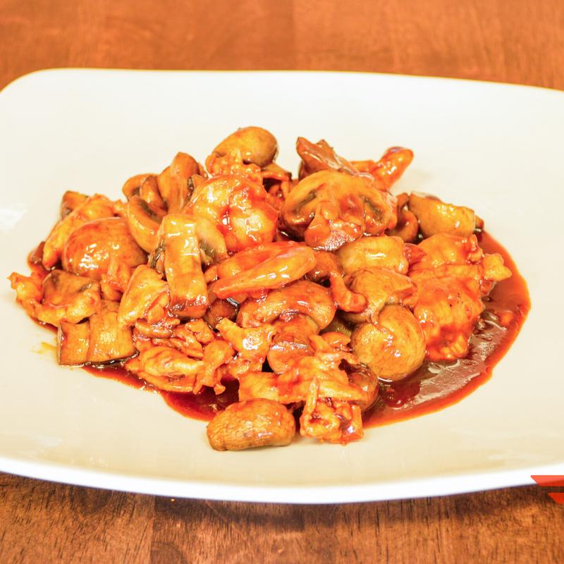 Beef, chicken, and shrimp sautéed with mushroom, scallion, spicy brown sauce