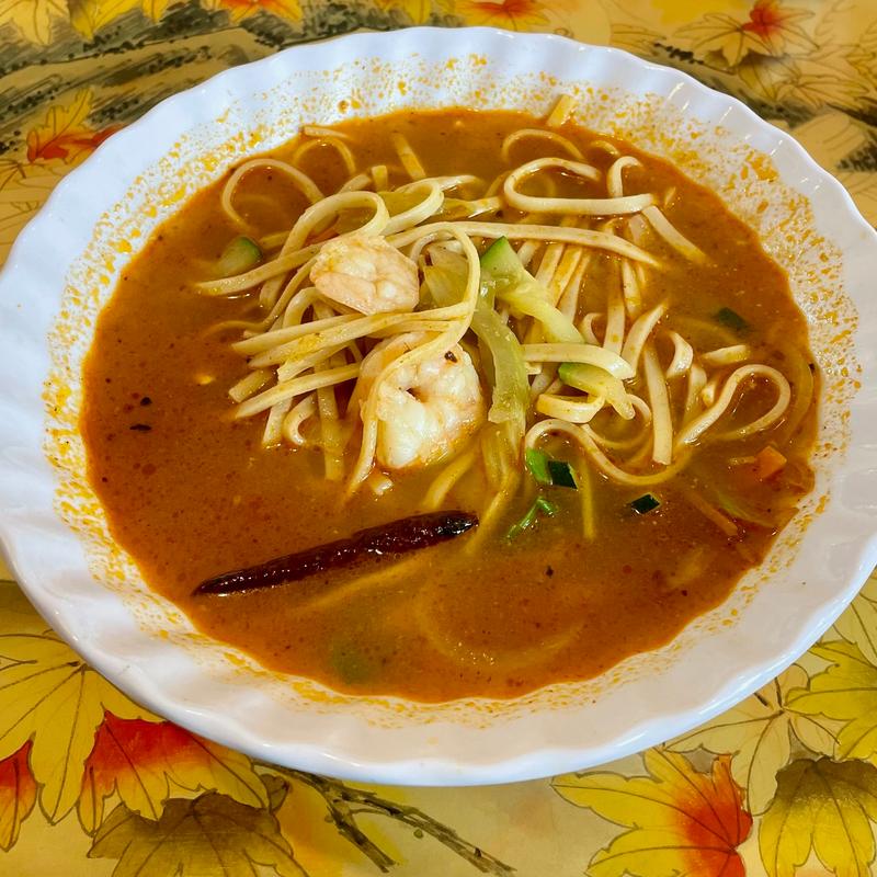 Shrimp sautéed with basil, bell peppers, green beans, zucchini, onions in a yellow curry sauce